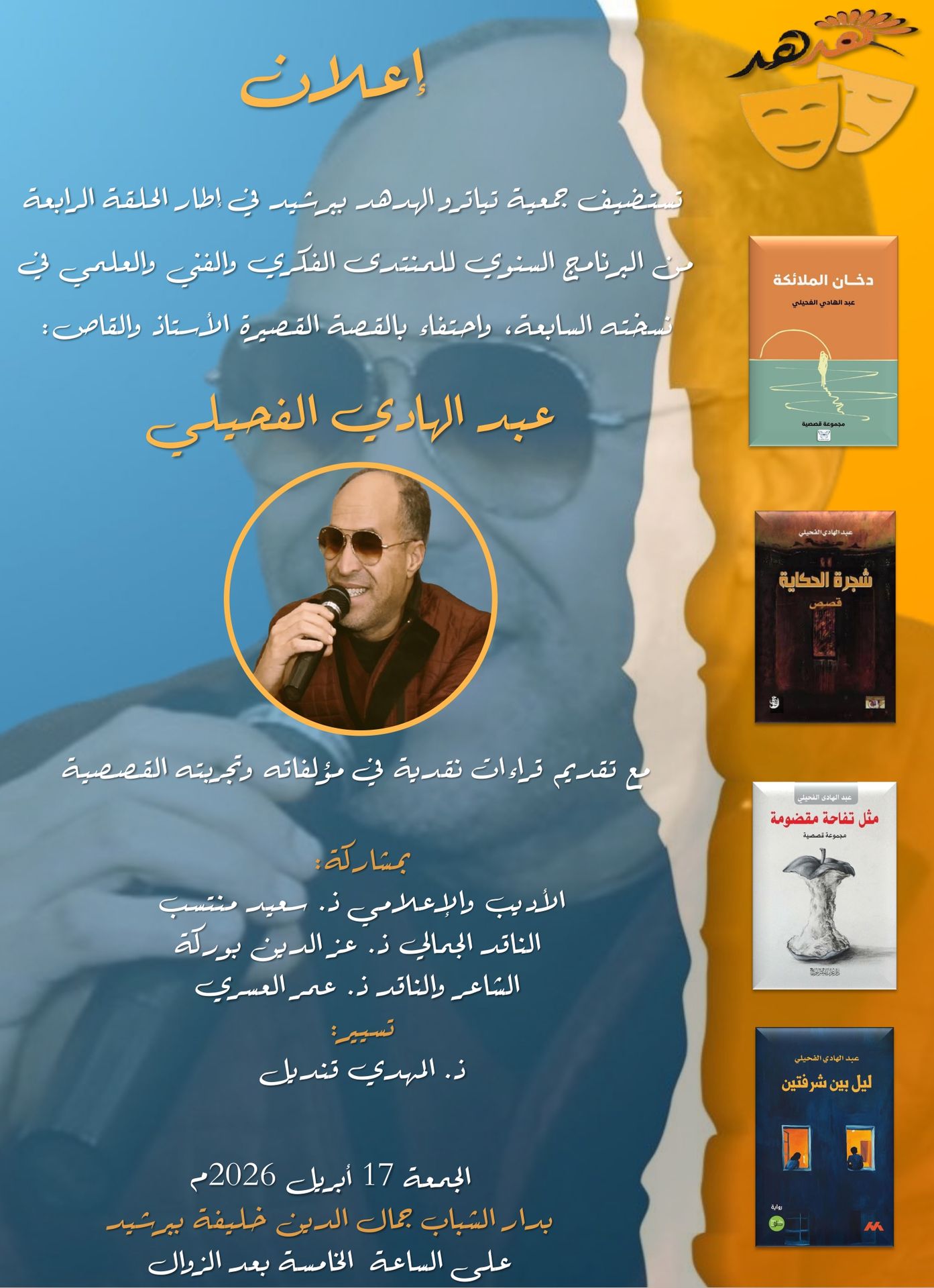 Cette rencontre, placée sous le signe de la célébration de la nouvelle, accueillera l'écrivain et nouvelliste Abdelhadi El Fouhaily pour une lecture critique de ses œuvres et de son parcours littéraire.